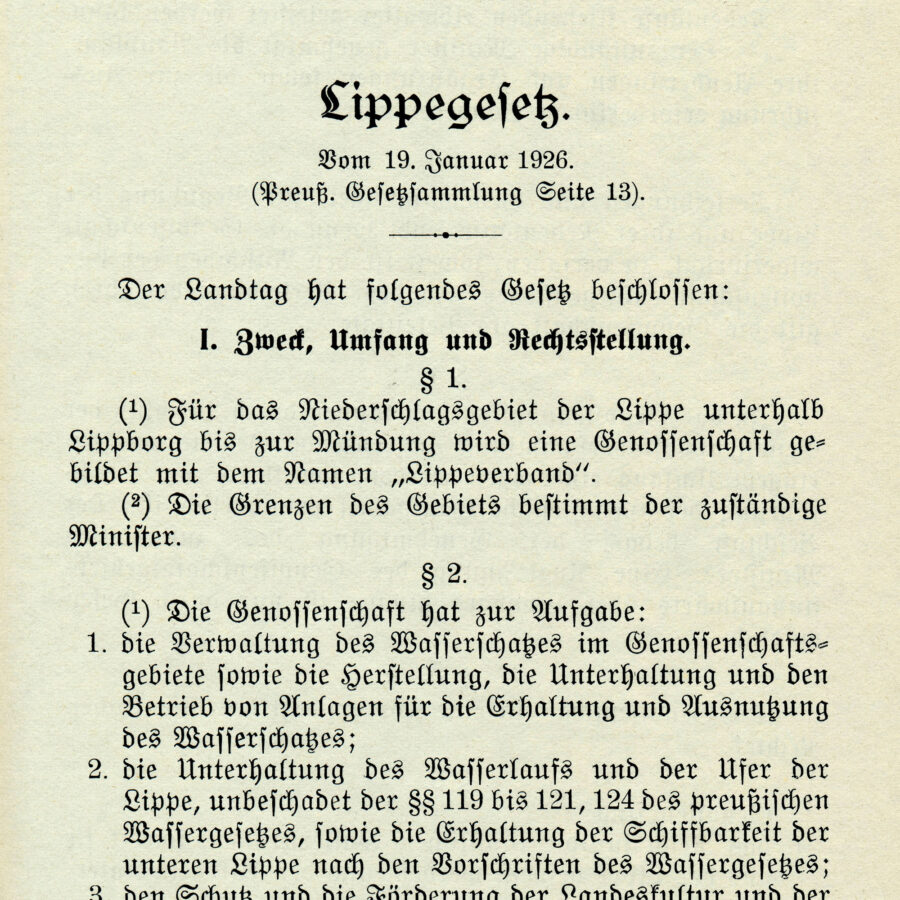19. Januar 1926Am 19. Januar wird das Lippegesetz verkündet und der Lippeverband gegründet. Die neuen Aufgaben sind die „Verwaltung des Wasserschatzes im Genossenschaftsgebiet sowie die Herstellung, die Unterhaltung und […] der Betrieb von Anlagen für die Erhaltung und Ausnutzung des Wasserschatzes“.