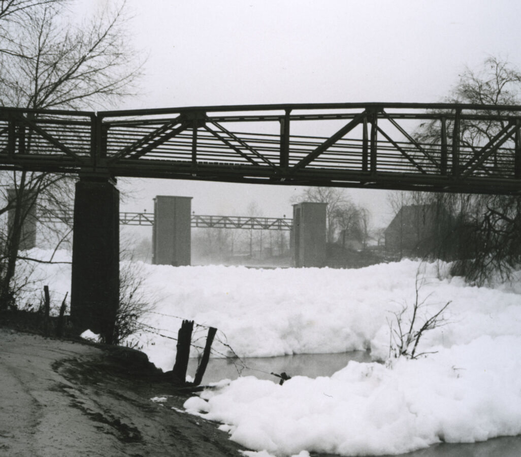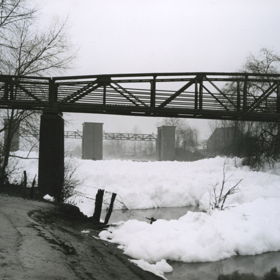 1964Am Wehr in Lünen-Beckinghausen türmen sich hohe Schaumberge. Ursache ist die zunehmende Verwendung tensidhaltiger Waschmittel seit Mitte der 1950er-Jahre. Diese können mit damaliger Anlagentechnik nicht ausreichend aus dem Abwasser entfernt werden und gelangen so in die Lippe.
