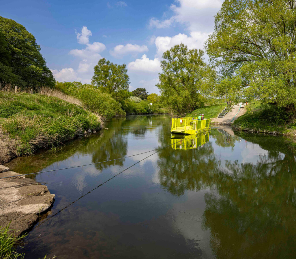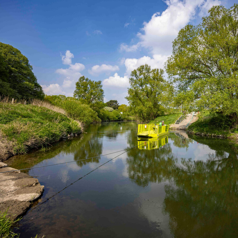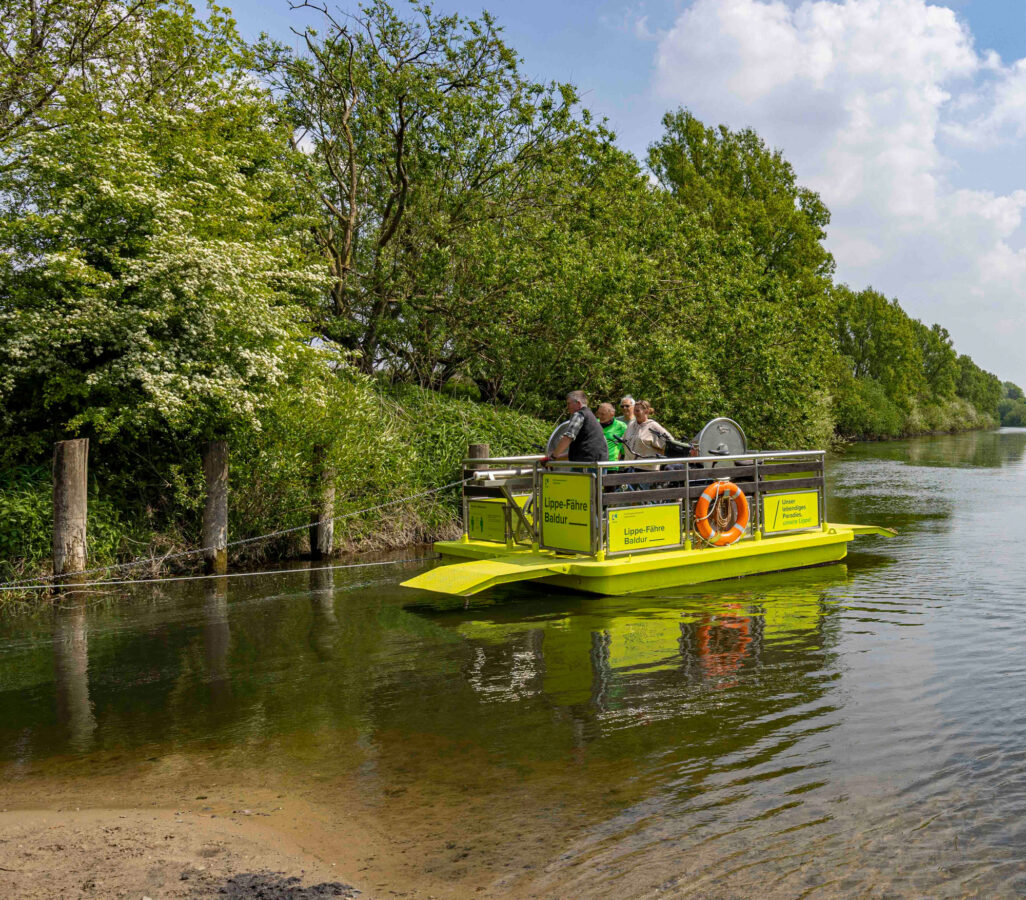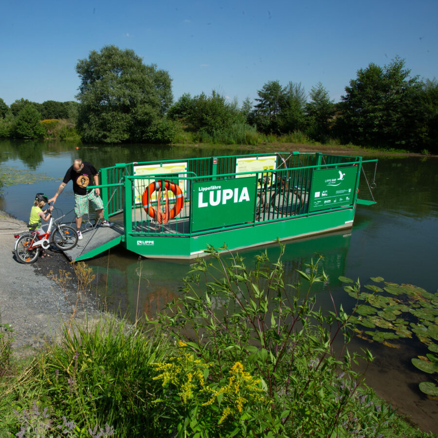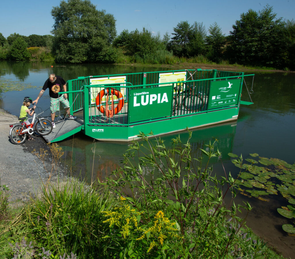 2013Die Jungfernfahrt der Lippe-Fähre „Lupia“ in Hamm wird von mehr als 100 offiziellen Gästen und Spaziergänger*innen verfolgt. Der Einweihung vorausgegangen war ein Namenswettbewerb, an dem sich viele Hammer Bürger*innen beteiligt hatten: „Lupia“ ist der lateinische Name des Flusses Lippe.