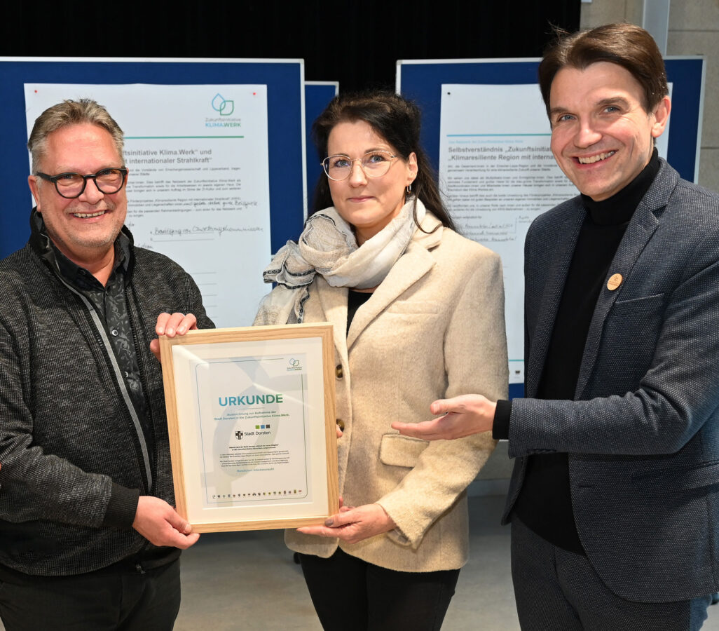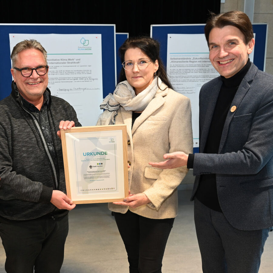 2024Die Zukunftsinitiative „Klima.Werk“ wächst ins Lippeverbandsgebiet hinein: Anfang des Jahres wird die Stadt Dorsten als Lippe-Mitglied offiziell aufgenommen: Prof. Dr. Uli Paetzel überreicht die Urkunde an Holger Lohse (Technischer Beigeordneter Stadt Dorsten) und Annette Ebener (Tiefbauamt Stadt Dorsten). Beim „Klima.Werk“ steht der wasserbewusste Stadtumbau im Mittelpunkt – also der Umbau zur Schwammstadt.